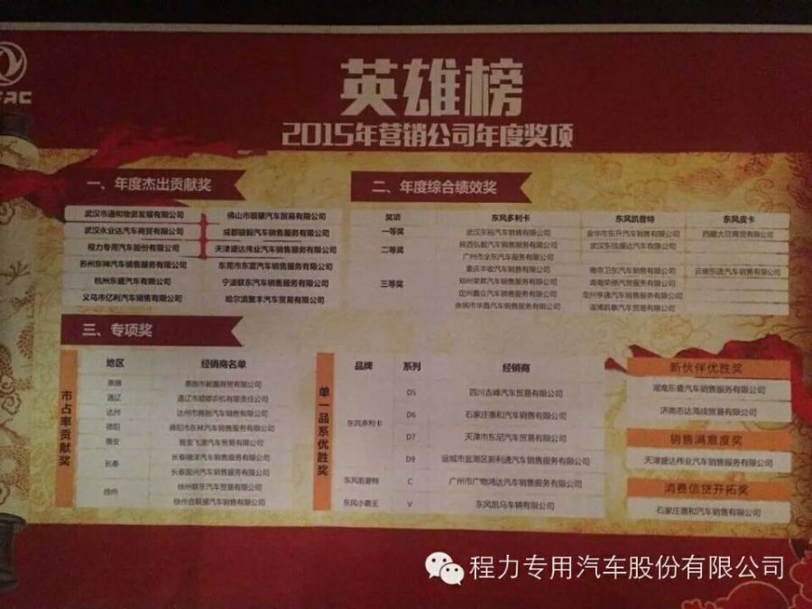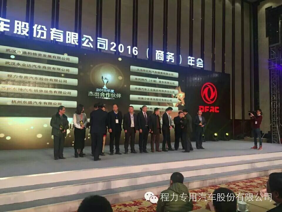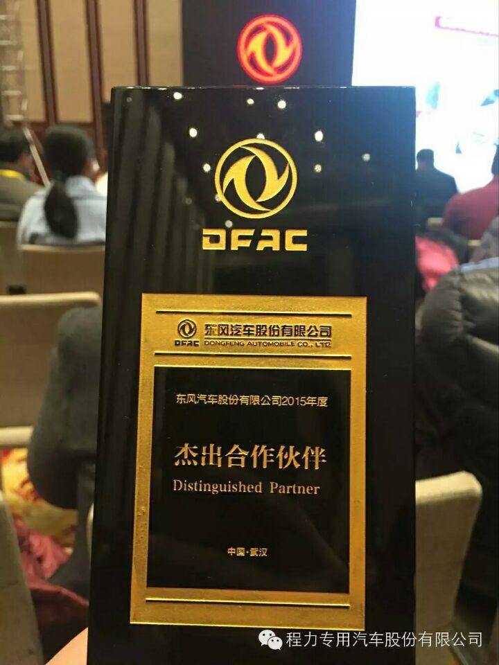 2015年12月19日,在武漢市,榮譽(yù)的桂冠再次戴到了程力公司的頭上,程力再度榮獲“東風(fēng)股份”專用車杰出合作伙伴獎(jiǎng) ”,東風(fēng)輕型商用車營(yíng)銷公司杰出貢獻(xiàn)獎(jiǎng),東風(fēng)工程車優(yōu)秀經(jīng)銷伙伴獎(jiǎng)。