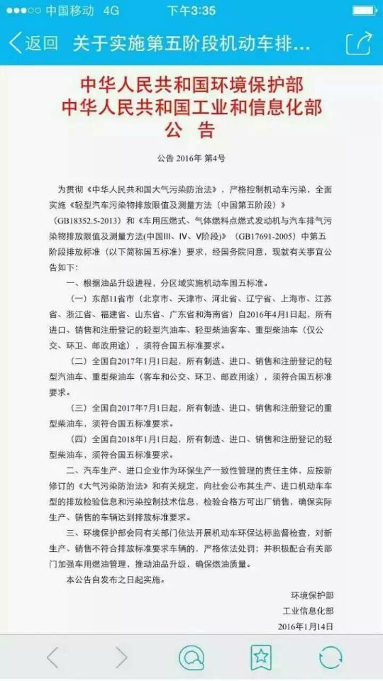 。ㄒ唬〇|部11省市(北京市、天津市、河北省、遼寧省、上海市、江蘇省、浙江省、福建省、山東省、廣東省和海南。┳2016年4月1日起,所有進(jìn)口、銷售和注冊(cè)登記的輕型汽油車、輕型柴油客車、重型柴油車(僅公交、環(huán)衛(wèi)、郵政用途),須符合國五標(biāo)準(zhǔn)要求。