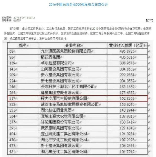 8月25日,全國工商聯(lián)發(fā)布“2016中國民營企業(yè)500強(qiáng)”榜單,華為以3950.09億元的年營收成為500強(qiáng)榜首。18家鄂企入圍(2015年16家),數(shù)量并列全國第五,位居中部第一。隨州的程力專用汽車股份有限公司以152.8953億元的營業(yè)收入全國排名317位,在湖北排名第9位。