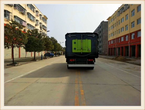 Ø 清水箱充分利用了車載空間,容積大,容積達9m3。垃圾箱采用單層304不銹鋼結(jié)構(gòu),傾翻卸料,帶高壓自潔裝置。自潔裝置可在垃圾箱卸料時幫助卸料,清洗垃圾箱內(nèi)部。
