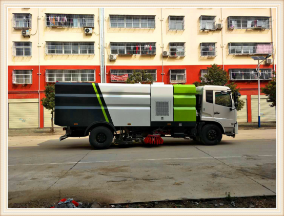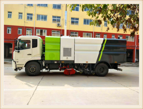 Ø 洗掃車采用東風天錦DFL1160BX1V型國Ⅴ二類汽車底盤改裝,加裝副發(fā)動機、風機、高壓水泵、清水箱、垃圾箱、左右立掃、帶噴水桿的寬吸嘴、低壓沖洗系統(tǒng)、掃盤降塵系統(tǒng)、液壓系統(tǒng)、專用裝置電控系統(tǒng)和副車架等改裝而成。